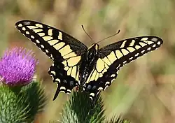 Papilio zelicaon, the anise swallowtail, is a common swallowtail butterfly of western North America. Both the upper and lower sides of its wings are black, but the upper wing has a broad yellow stripe across it, giving the butterfly an overall yellow appearance. There are striking blue spots on the rear edge of the rear wing, and the characteristic tails of the swallowtails. Its wingspan is 52โ80 mm (2.0โ3.1 in). Its body is somewhat shorter than the rather similar western tiger swallowtail, with which its range overlaps; it also lacks the black stripes, converging toward the tail, of the latter. There is a somewhat darker subspecies, P. z. nitra, which is rare throughout the range, though somewhat more often found at lower elevations. [2][3]