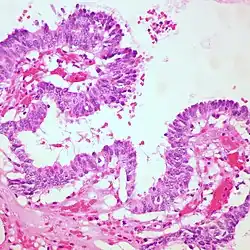 The microscopic histopathology of typical PDCIS lesions (refer to adjacent high-power photomicrograph) prepared with a hematoxylin and eosin stain consists of mammary ducts that have papillary fronds (i.e. thin, finger-like or leaf-like structures) lined with one or several layers of neoplastic, columnar-shaped epithelial cells (i.e. tall, narrow cells with their nuclei close to the site of their ductal attachment).[4] The fronds have branching fibrovascular cores. Epithelial cells lining the fronds' inner surfaces commonly form solid, cribriform (i.e. large nests of cells perforated by many rounded, variably sized spaces), or micro-papillary patterns. There may be a second population of epithelial cells lining the papillae that have abundant clear cytoplasm in addition to the usual neoplastic epithelial cells which line the papillae. These cells, which are not myoepithelial cells, have been termed globoid cells.[7] They have eosinophilic cytoplasm (i.e. pink or red cytoplasm due to its uptake of eosin stain).[6] PDCIS tumors with these cells have been termed dimorphic variants of PDCIS.[3] Myoepithelial cells are typically present at the periphery of the fronds but absent within the involved ducts.[4][7] The presence of a fibrous capsule and/or absence of peripherally located myoepithelial cells are strong indicators that the tumor is an ESP rather than a PDCIS.[3] PDCIS tissues may also contain areas of "Comedo-type necrosis", i.e. areas where dead cells have accumulated.[6]