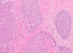 Microscopic histopathological analyses of SPC lesions (refer to adjacent high-power photomicrograph) generally show tumors with multiple circumscribed nodules of expanded ducts filled with neoplastic epithelial cells which may appear spindle-shaped or plasma cell-like, have red to pink cytoplasm due to the uptake of eosin after staining with hematoxilin & eosin, and eccentrically-placed nuclei. Rarely, signet ring-shaped cells are present. The tumors may have cystic and hemorrhagic areas. Myoepithelial cells are found within and at the periphery of these tumors. The papillary architecture seen in the other SCB types is in general not apparent; rather, pseudo-rosettes (i.e. radial arrangements of neoplastic cells around small blood vessel) and nuclear palisading (i.e. parallel arrangements of the nuclei in rows of tumors that resembles picket fences) around stromal cores (i.e. supporting tissues) may be seen. SPC tumor tissues typically (>50% of cases) have areas of neuroendocrine differentiation. The presence of these areas strongly supports the diagnosis of SPC.[21] The signet ring-shaped cells in these tumors contain cytoplasmic mucin-containing vacuoles which push their cells' nuclei to one side.[10] Mucin may also occur outside of cells in these lesions. The presence of signet ring-shaped cells bearing mucin-containing vacuoles with or without extracellular mucin strongly supports the diagnosis of SPC. SPC is considered invasive when the tumor nests have a characteristic jigsaw growth pattern with ragged and irregular margins with the loss of myoepithelial cells at the site(s) of invasion.[21] Rarely, invasive SPC occurs with nearby invasive carcinoma of NST, lobular carcinoma, cribriform carcinoma, or tubular carcinoma breast tumors.[3]
