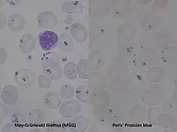 Pappenheimer bodies are visible with a Wright and/or Giemsa stain. Confirmation of non-heme iron in the granules is made with a Perls' Prussian blue stain, and this atypical red blood cell is then known as a siderocyte.[5] Only the finding of ring (or ringed) sideroblasts characterizes Sideroblastic anemia.