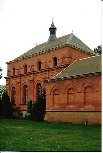 When operational, each of the three boilers consumed about 2 tons of coal per day, and initially generated 130 hp (97 kW) of power, which was later uprated to 250 hp (190 kW).[6] Cooling water was obtained from an ornate cooling pond, located in front of the engine house, which had scalloped edges, a central fountain, and was surrounded by ornamental gardens. It held 1.25 million imperial gallons (5.7 Ml) of water.[8] The buildings, which are grade II* listed structures and a scheduled ancient monument, were built in Gothic Revival style, and internally, the main engine house has outstanding cast iron fittings and stained glass.[9] They were paid for with money left over after the construction of the building came in under budget.[10] The total cost of construction was £55,000 (equivalent to $7,500,000 in 2023).[11][6] The slate roof of the boiler house is of fireproof cast iron construction. Rather than the usual wooden laths to support the slates, they rest on angle irons, held in place by lead nails and 'torched' on the inside with mortar.[12]
