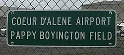 In August 2007, the Coeur d'Alene airport was renamed the "Coeur d'Alene Airport–Pappy Boyington Field" in his honor and dedicated the following month.[46][47][48][49] An independent documentary film called Pappy Boyington Field was produced by filmmaker Kevin Gonzalez in 2008, chronicling the grassroots campaign to add the commemorative name.[50] The film showcases many of the local veterans who were involved with the campaign, as well as the personal insights into Boyington's life provided by his son, Gregory Boyington, Jr., and the actor Robert Conrad, who portrayed him in the television series.[51]