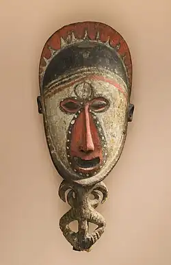 European sailors first made contact with the peoples of Papua New Guinea, as well as many other islands in Oceania, as early as the 16th century. New Guinea was colonized and divided between the German Empire and the Great Britain by 1884; Australia would later take control of the nation of Papua New Guinea in 1921 following World War I.[9] During the Papua New Guinea's period of colonization in the 19th and 20th centuries, European collectors frequently exported art pieces from the colony abroad to England and Australia. This practice was so commonplace that it led to common artistic objects virtually vanishing from local villages. The Papua New Guinea National Museum and Art Gallery was later opened in 1977 to combat this phenomenon.[10] Despite the removal of many artifacts, the actual indigenous methods of art themselves survived and continued to be practiced by natives, somewhat unaffected by the European colonization of the islands.[5]