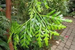 It is usually a medium-sized to large evergreen tree 16–50 m tall, at high elevations only a shrub reaching up to 3 m). The foliage is borne in flat sprays, with the leaves scale-like, in opposite pairs, with facial and lateral pairs alternating; the lateral leaves are larger, 2–3 mm long on mature trees and up to 20 mm long on young trees, the facial leaves smaller, 1 mm on mature trees and up to 8 mm on young trees. The cones are 1–2 cm long, with four scales, a small, sterile basal pair, and a larger fertile pair; the fertile scales each bearing two winged seeds.[3]