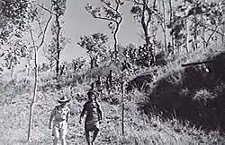 At dawn C Company, PIB moved back to the beach to regroup, with Lieutenant Colin Rice assuming temporary command as the platoons prepared to set off towards their objectives.[156] 10 Platoon cleared the beach north toward Bonga which was found to have been vacated, while 9 Platoon moved south, conducting a reconnaissance along the Sattelberg Road in the direction of Tareko. The following morning they moved up the road towards Jivevaneng, probing in front of the advancing Australians.[158] Reaching the mission station 9 Platoon found it deserted, and it was subsequently occupied.[159] An area of tactical importance due to its dominating position and the observation it provided, D Company, 2/17th Battalion pushed past the mission, and by 25 September was 5 kilometres (3.1 mi) west before meeting resistance. Confronted by a strong Japanese force, the Australians were forced back to Jivevaneng, but repelled six strong attacks on their position over the following days before being relieved by two platoons from the 2/43rd Battalion under Captain Eric Grant.[160] On 30 September Grant's understrength company and the Papuans from 9 Platoon were surrounded and cut-off but were able to hold off a number of attacks over the next four days. An attempt by two other Australian companies to break through failed before a PIB sergeant and a group of scouts from the main force was finally guided into the position by two Papuans that had been sent out to through Japanese lines. On 4 October they led the encircled force out carrying their wounded, just hours before a relief force finally pushed its way through.[159][161][162] Meanwhile, Finschhafen had fallen two days earlier.[81] During this time 10 Platoon had been working with the 2/3rd Pioneer Battalion which was guarding the approach between the Song River and North Hill.[159]