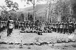 On 9 August, a patrol from 8 Platoon to New Labu Island was attacked by a group of Japanese and hostile villagers, with two Papuans and a number of Japanese killed.[114] Although costly, the patrol confirmed the Japanese were unaware of Allied preparations to attack Nadzab. B Company continued patrolling the southern bank of the Markham River, reporting on troop movements and dispositions. On 24 August they came under command of New Guinea Force and were ordered to prepare for the crossing of the Markham and assault on Nadzab. The PIB subsequently manned staging camps and guard posts along the river, which were in place by 27 August.[115] In early September they patrolled between Mount Ngaroneno and the mouth of the Watut River to ensure it was clear of Japanese forces. Meanwhile, a small party crossed the Markham in a rubber dingy, scouting towards the proposed drop zone.[115] On 4 September, a force, including the 2/2nd Pioneer Battalion, and engineers from 2/6th Field Company married up with B Company, PIB, at Kirkland's Crossing after moving overland from Tsili Tsili, and began to prepare the airfield.[116][117] With the campaign reaching a crucial point, a combined landing at Nadzab by US paratroopers and Australian artillery took place on 5 September.[115] During the landing the Papuans picqueted the south bank of the Markham, and with the pioneers successfully establishing a beachhead they then crossed with the engineers.[118] As the airdrop proceeded, the Papuans were tasked with assisting to secure the upper Markham Valley against any possible Japanese move to reinforce Lae from Madang.[119] With Nadzab captured preparations began to allow the Australian 7th Division to fly in so as to complete the encirclement of Lae, following landings to its east by the 9th Division which had begun the day before.[120]