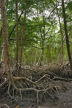 The ecoregion is in the Neotropical realm and the mangrove biome.[1] Mangroves form a continuous belt along the Pará and Maranhão coasts, with six species of mangrove trees and several associated species.[6] They are important as a nursery for fish and in protecting the coast, and provide an important source of food and other resources to the local human population. The mangroves of Pará and Maranhão extend along 650 kilometres (400 mi) of coast and cover about 700,000 hectares (1,700,000 acres) or about 85% of mangroves in Brazil.[5] The mangroves benefit from the constant influx of fresh water from rainfall and from the Amazon River. However, they must compete with freshwater hardwood species typical of the Amazon rainforest.[1]