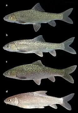 Lateral views of Paracapoeta erhani from various streams in its range. d at the bottom is from the type locality of C. turani
