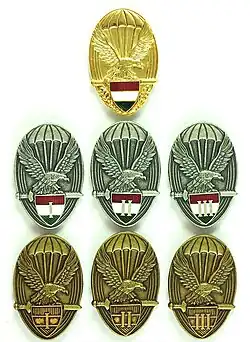 The Hungarian Defense Forces award four classes of parachutist badges to personnel who are qualified as military parachutists. The current version has been awarded since 1990.