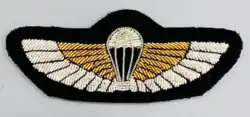 The Parachute Badge with Wings insignia, which depicts an open parachute embroidered in white flanked by a pair of wings embroidered in light blue, is only to be worn by a qualified parachutist who has subsequently been on the posted strength of a unit where they may be ordered in the course of their duties to parachute.[4] Those who do not serve with a parachute unit are permitted to wear the Parachute Badge without Wings, colloquially known as the 'Lightbulb'.[5]