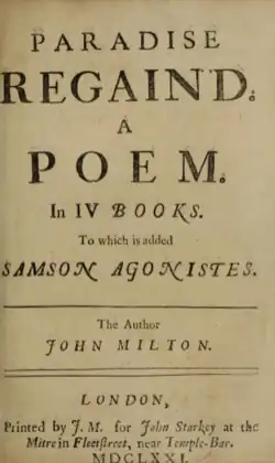 - ^ Milton, John (1671). Paradise Regained; A Poem in IV Books; To Which is Added Samson Agonistes. London: John Starkey at the Mittre in Fleetstreet, near Temple Bar. Retrieved 9 October 2023 – via Google books.