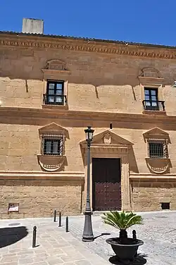 The original building of the Parador de Úbeda was a palace built in the early and mid-sixteenth century for Hernando Ortega y Salido (c.1490—1571), dean of the cathedral of Málaga and head chaplain of the Holy Chapel of El Salvador of Úbeda, the church next door to the Parador. He wished to have a private residence close to the building of which he was in charge.[4] The palace is believed to have been designed by the architect Andrés de Vandelvira (1509—1575), one of the important architects of the Spanish Renaissance and designer of the cathedral of Jaén as well as many of the main edifices built in Úbeda at that time.[1] The royal architect Luis de Vega (d.1562) is believed to have collaborated in the building's design.[5] It is not known precisely when building work began, but documentary evidence suggests it was during the 1540s. There is a record of welding and carpentry being carried out early in the 1550s. The construction was completed in early in the 1570s.[4] Dean Ortega did not live in the palace as he died in 1571.