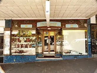 In 1925 Zacharias Simos employed H. & E. Sidgreaves, the shop-fitting firm responsible for the design of Washington H. Soul's Sydney pharmacies, to convert the interior of the cafe premises on classical (Art Deco) lines, along with local architect Harry Lindsay Blackwood.[12] A soda fountain, of the finest Moruya marble, and booths of Queensland maple were installed as were the timber-panelled walls decorated with alabaster friezes depicting classical Greek figures. The fine and intact leadlight shopfronts which characterise the building were probably included in this work and have become an important part of the architectural character of Katoomba Street. The street contains many other fine examples of glazed shopfronts from the 1920s and it has been suggested that together they may be the largest extant collection of 1920s leadlight shopfronts in NSW and comparable to Canowindra in the central west of NSW.[13][1]