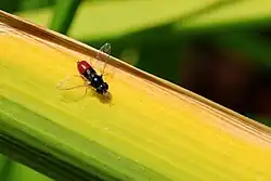 Paragus haemorrhous, the black-backed grass skimmer is a common widespread species of hoverfly found in many parts of Europe, Africa and the Nearctic. Hoverflies can remain nearly motionless in flight. The adults are also known as flower flies for they are commonly found on flowers from which they get both energy-giving nectar and protein-rich pollen. The larvae are predators on aphids.[1][2]
