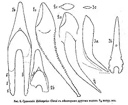 - ^ a b c d e f g h i j k l m n o p q r s t u Karpinsky, Alexander Karpinsky (27 April 1916). "On a new species of Helicoprion (Helicoprion clerci, n. sp.)". Bulletin de l'Académie Impériale des Sciences de Saint Pétersbourg (in Russian) (6): 701–708 – via Biodiversity Heritage Library.