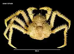 Paralomis spinosissima's carapace is pyriform or nearly pentagonal and is slightly longer than it is wide.[4] Its rostrum extends past the eyestalks and consists of three sharp spines – one medial pointing forward and two dorsal diverging outward and upward.[4] Its carapace is covered with long, conical spines, and its walking legs and chelipeds are densely covered in long, sharp ones.[4] The lateral and posterior regions of the carapace are covered by small spines, while the dorsal and ventral margins are covered in tall spines and blunt spines, respectively.[4] It can grow up to 126 mm (5.0 in) in length and 132 mm (5.2 in) in width, and adults have weighed up to 1.40 kg (3.1 lb).[6]