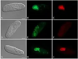 P. caryophila are parasitic inside the nucleus of P. biaurelia. As with other species of Holospora, they rely on the protist for amino acids, energy metabolic pathways including glycolysis and the citric acid cycle, as well as for nucleotides.[14] In contrast, Bealeia paramacronuclearis and Fokinia cryptica are cytoplasmic parasites. Bealeia paramacronuclearis are spherical or oval shaped measuring about 1.8 to 2.4 μm long and 0.4 to 0.5 μm broad. Inside the protist, they are arranged in clusters of about 7 to 8 cells in parallel lines. They mostly lie close to the macronucleus (the reason for the species name) and sometimes appear attached to the nuclear envelope. Fokinia cryptica are smaller with the diameter 0.35 to 0.40 μm. They are more randomly distributed in the cytoplasm.[4]