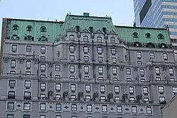 The hotel's original decorative features included bronze elevator doors in the Baroque style, as well as marble stairs with iron handrails.[42] After the 1990 renovation, the elevators were refitted with multicolored lights in emerald, ruby, indigo, and amber colors.[26] The elevator lobby was redecorated with mirrored walls, which one publication likened to a "funhouse".[24]