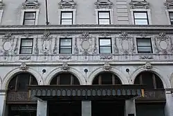 At ground level, the 46th Street facade consists of a double-height colonnade with twelve round arches, spanning the width of the hotel. The arches are supported by white marble piers above a granite water table. Most of the ground-level openings contain storefront windows or doors. The third and fourth bays from the right contain the hotel's entrance, while the fifth bay from the left contains an entrance to Sony Hall.[19] Two ornate marquees, one each in front of Sony Hall's and the hotel's entrances, were installed as part of a 2013 renovation.[20] The piers on either side of the Sony Hall entrance contain bronze-framed sign boards. The upper portion of each arch contains a tripartite iron frame, which separates the cast-iron spandrels between the ground and mezzanine windows, as well as the mezzanine windows themselves. The tops of the arches are surrounded by moldings, and the keystone of each arch contains a volute with ribbons on either side. A marble string course runs above the first-story colonnade.[19]