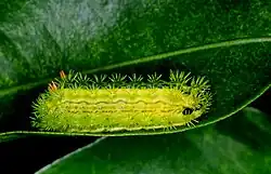 The egg stage lasted six days, the larval stage forty days and the pupal stage twenty-two days, may fluctuate with climatic changes.[4] The larvae are considered pests and have been recorded from commercial crops[5] like coffee, rubber, oil palm, cocoa, cassava, tea, ebony, coconut, gliricidia, banana, winged bean and mango.[6] The female is known to emit pheromone (Z)-7,9-Decadien-1-ol as a semiochemical.[7]