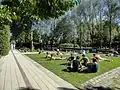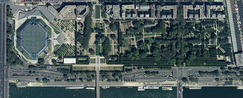 The Parc de Bercy (French pronunciation: [paʁk də bɛʁsi]; English: Park of Bercy) is a public park located along the Rive Droite in the 12th arrondissement of Paris.[1] Development started in 1994 on the site of a former wine depot (the wine warehouses of Bercy, which in the early 20th century was the largest wine market in the world) before an official opening three years later by Mayor Jean Tiberi.[2] Sponsored by President François Mitterrand, the project covered 14 hectares (34.6 acres).