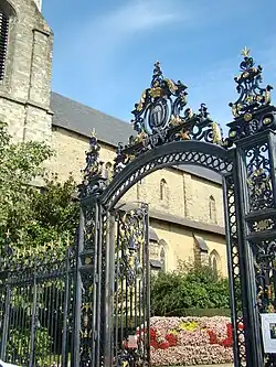 Overlooking Place Saint-Melaine, the former forecourt of the abbey, the entrance is marked by a monumental gate, bearing the coat of arms of Rennes. It is a work by Jean-Baptiste Martenot which replaced the grid previously executed by Vincent Boullé, municipal architect of Rennes during the Restoration. The old gate was supported by two pillars crowned with cast iron vases. A low wall extended on either side of the pillars, punctuated by six slightly projecting pilasters, was also adorned with cast iron vases.