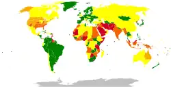 Traditionally, corporal punishment of minor children is legal unless it is explicitly outlawed. According to a 2014 estimate by Human Rights Watch, "Ninety percent of the world's children live in countries where corporal punishment and other physical violence against children is still legal".[21] Many countries' laws provide for a defence of "reasonable chastisement" against charges of assault and other crimes for parents using corporal punishment. The defence is ultimately derived from English law.[22] Due to Nepal banning corporal punishment in September 2018, corporal punishment of children by parents (or other adults) is now banned in 58 countries.[23]