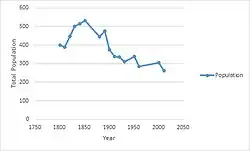 Population of Parham 1801 -2011 shows that Parham's population has been declining, going from 399 in 1801,[11] to 263 in 2011.[12] There has been some fluctuation in the population of Parham however, rising to a high of 532 in 1851 after rising steadily in prior years. Since 1851, the population steadily declined, as seen in the graph, only rising again in 1951, after the baby boom after the second world war ended. The population is the lowest it has been recorded. The current population level is 263, which is a density level of 0.3[13] which is incredibly low compared to towns in the surrounding area, such as Framlingham.
