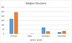 The primary religion in Parham is the Church of England, with this being the confession of the parish church. As of 2001, 245 people identified as Christian, however, by the 2011 census this had decreased to just 171, there has also been a decline between 2001 and 2011 in those who identify as either other, from 3 to 1, and those who do not state their religion, from 31 down to 19. In contrast, the number identifying as no religion has increased from 28 to 71 between 2011 and 2011.[14][15]