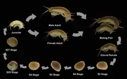 Females produce embryos every 2 weeks once they reach sexual maturity. Embryogenesis is relatively short, lasting about 10 days at 26 °C (79 °F). Females normally brood the embryos in a ventral brood pouch. Close examination of the embryonic development of P. hawaiensis has produced the most detailed staging system for any crustacean.[7] Complete embryogenesis has been divided into 30 discrete stages, which are readily identifiable in living animals or by means of common molecular markers in fixed specimens. Hatchlings possess a complete complement of segments and appendages which are morphologically similar to those of adult animals.
