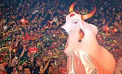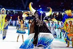The festival celebrates the Bumba Meu Boi, a legend about a resurrected ox. It is also a competition where two groups that perform this play, the Boi Garantido (red) and Boi Caprichoso (blue), compete in extended retellings of the story, each team attempting to outdo the other with flamboyant dances, singing, and parade floats. Each team has to complete its show within two and a half hours. A team that does not follow this time limit is subjected to points penalties. Each nightly performance is largely based on local Amazonian folklore and indigenous culture, but also incorporates contemporary Brazilian rhythms and themes.[3][4] The place where the teams present themselves is the Parintins Cultural Center, known as "Bumbódromo", a round, grounded stage. The "Bumbódromo" supports 35.000 people in the audience.[5]