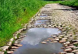Paris–Roubaix is famous for rough terrain and cobblestones, or pavé (setts),[n 1] being, with the Tour of Flanders, E3 Harelbeke and Gent–Wevelgem, one of the cobbled classics. It has been called the Hell of the North, a Sunday in Hell (also the title of a film about the 1976 race), the Queen of the Classics or la Pascale: the Easter race.[1] Since 1977, the winner of Paris–Roubaix has received a sett (cobble stone) as part of his prize.[2]