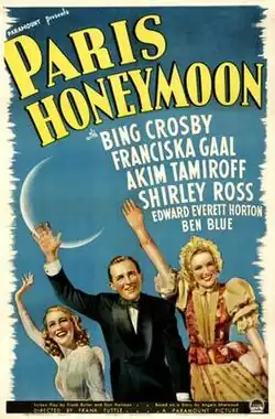 Paris Honeymoon is a 1939 American musical film directed by Frank Tuttle and written by Frank Butler and Don Hartman. The film stars Bing Crosby, Franciska Gaal, Akim Tamiroff, Shirley Ross, Edward Everett Horton and Ben Blue.[1][2] Filming took place in Hollywood from May 23 to July 1938 and the film was released on January 27, 1939, by Paramount Pictures.