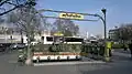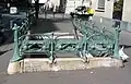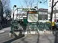 Rather than stone, Guimard used cast iron set in concrete both to reduce costs and to suit the sinuous Art Nouveau forms;[3][6] they were painted in a green emulating weathered brass.[7] (For a renovation that began in 1999, the RATP, the Paris transportation authority, restored the entrances to two slightly different shades: at sites with a lot of vegetation, vert wagon ('train-car green'), the dark green used for Parisian public works at the turn of the 20th century, and at fully urban sites, a slightly bluer shade, vert allemand ('German green').[8]) He designed standardized components, including railing cartouches incorporating the letter "M" and signs in his own distinctive lettering reading "Métropolitain" or, at narrow entrances, "Métro"; later the use of the lettering was extended to a holder for a system map and for advertising (porte-plan) with the station name above. In addition to speed (the first set of entrances were installed within six months of their design)[9] and relatively low cost in manufacture and adaptation to different sizes and locations of entrances, all of this gave the system a stylistic identity.[6][10]