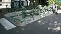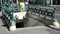 Three of the entrances took the form of free-standing pavilions or small stations,[5] including waiting rooms: one at Bastille and two on Avenue de Wagram at Étoile. These were in a style influenced by Japanese pagodas. At Étoile Guimard provided exterior doors for elevators, although the elevators were not built.[10] Eight simpler but still elaborate structures, labeled "Édicule B" by Guimard, were installed at the termini of Line 1 as originally opened and at two other major stations. These consisted of three-sided glass-roofed structures enclosing the stairway, with a projecting canopy.[10][11][12] A variation on this format, "Édicule A", lacked the canopy and was erected at two stations, Saint-Paul and Reuilly – Diderot.[10] These édicule types of entrance, which have come to be called libellules because they resemble dragonflies, in some cases had decorated wall panels surfaced in reconstituted lava.[11] The great majority of the entrances built (154) were unroofed enclosures, dubbed an entourage. A transitional form between the entourage and the édicule, railings with a roof and canopy, was used for one entrance at the Gare de Lyon métro station.[13]
