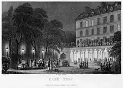 The other common means of transport was the fiacre, the taxicab of its day. It was a small box-like coach that carried as many as four passengers; it could be hired at designated stations around Paris. A single journey cost 30 sous, regardless of distance; or they could be hired at the rate of 45 sous for an hour. The drivers expected a tip, and, according to a guidebook of 1842, became extremely unpleasant if they did not receive one.[10]
