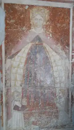 The frescoes preserved here, although somewhat deteriorated, represent an interesting example of painting dated to the 11th century.[note 11] In the western apse is, placed in the semi-catin, a Christ Judge with a red cloak over his shoulder and surrounded by symbols of the evangelists. Three seraphim can be seen under the lap of the apse, while on the walls next to the apse area are depicted, on the right, a bearded saint wearing a short tunic streaked with green, and on the left a more youthful-looking soldier saint wearing a chlamys trimmed with gems.[9]