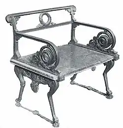 The wrought iron garden furniture is missing. Due to its great weight it was probably kept at outdoor places for the tea parties during the summer season which lasted from 1 May(day of purchase of Glienicke) until 3 November (Hubertus's hunt). Some of the garden furniture was probably designed by Schinkel,[24] other parts were in Louis Quinze style or Empire style.[14]: 48 Wrought iron benches were presumably placed at smaller vantage points like e.g. the Lilac Pergola on the Lenné hill(as it is called nowadays) or the Lime Trees Pergola. The Lime Trees Pergola is the only non-architectural pergola in Glienicke which is still visible today. It consists of eight lime trees at a junction near the Cloister Courtyard which are the remains of the late 18th century geometrical aligned avenue trees. Near Lions Fountain and Stibadium the “Sphingentreppe”, a low rise flight of steps, is covered with a trellis designed by Persius. The flight of steps is named after the Sphinx statues placed at the foot of the steps which like the ill-fitting steps are from the demolished neoclassical greenhouse with a garden room at the site of today's Stibadium.