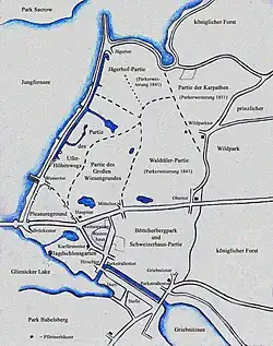- ^ a b c d e f g h i j Seiler, Michael: “Die Entwicklungsgeschichte des Landschaftsgartens Klein-Glienicke 1796–1883”[The evolution of the landscape garden Klein-Glienicke 1796–1883], Dissertation, 1986, Hamburg