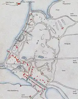 Park Glienicke, (German: Park Klein-Glienicke or Glienicker Park) is an English landscape garden in the southwestern outskirts of Berlin, Germany. It is located in the locality of Wannsee in the Steglitz-Zehlendorf borough. Close to Glienicke Bridge (known as Bridge of Spies) the park is open to the general public. The park is part of the UNESCO World Heritage Site Palaces and Parks of Potsdam and Berlin (Potsdam cultural ensemble).[1] Within the ensemble it is one of the five main parks, the others being Sanssouci Park, New Garden (Neuer Garten), Babelsberg Park and Peacock Island (Pfaueninsel). Regarding diversity in gardening styles within the Potsdam park ensemble Park Glienicke is only superseded by Sanssouci Park. Furthermore, it is a park especially characterized by one personality due to the intense involvement of Prince Charles of Prussia. The park covers approximately 116 hectares (290 acres)[2]