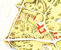 Elliptical and round flower beds with terracotta palmette borders are typical for garden courtyard and pleasure ground. The restoration was supported by discovering original border stones in the cellar of the Curiosity pavilion.[12] In the underground the beds are walled in allowing for specific irrigation, therefore the pleasure ground has been crisscrossed with water pipes. As the clay pipes on Peacock Island lasted only ten years after being installed in 1824 expensive iron pipes supplied by the Prussian industrial pioneer F.A. Egells (de) were installed in Glienicke when in 1838 the pumping station started operating with a steam engine, a gift by Charles’ father which was also manufactured by F.A. Egells.[5]: 202 The beds were filled with a loose subsoil which facilitated the quick replacement of plants. There are some figurative designed beds bordered with buxus which add to the pleasure ground an artificial aspect, e.g. the Oak Leaf bed near the Lions Fountain and the Diana(Greek:Artemis) or Pliny bed at the Casino. An Athena statue, which is now at the British Museum, stood in a niche on the northside of the Casino characterizing it as a place of art. Most striking is the Lilies bed beneath Charles' bedroom windows at the western facade of the palace. It is a heraldic sign referring to Charles' younger sister Louise who was married to Prince Frederick of the Netherlands. She was very supportive sending bulbs to Charles. In Glienicke planting of roses has been almost non-existent in contrast to Babelsberg Park and Peacock Island. The pleasure ground in Glienicke is rather a portrayal of an antique villa complex as described by Pliny the Younger than a reflexion on a longing for Italy(Italiensehnsucht).
