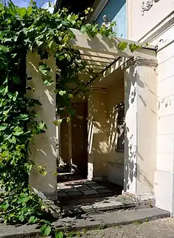 The pavilion named Curiosity dates back to 1796 and was rebuilt in strict Doric order by Schinkel in 1825. It has a cellar.[13]: 36 Its name derives from the fact that it could be used to watch the traffic on the adjacent Berlin-Potsdam chaussee through the shutters while being invisible to passers-by. Around 1848 the pavilion became a place for arts collection. Spolia were inserted in the entrance hall. At the same time a Florentine Renaissance arcade was installed as a cover on the garden façade. Already in 1842 the arcade was bought from the Russian arts collector Anatoly Demidov who lived in Florence.[14] : 78