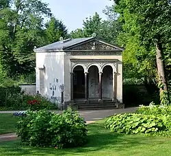 The Stibadium was designed by Friedrich Ludwig Persius and built on the site of a neoclassical greenhouse with a garden room(built after 1796) in 1840.[16]: 63 The semi-circular Tholos structure with a wooden half-cone roof was the main place for having tea. On the underside of the roof a twelve deities programme is painted. As there are 14 fields the Twelve Olympians were supplemented with Bacchus and Amphitrite. The middle pillar had originally a zinc-cast Kore designed by August Kiss which later was replaced with a marble copy of the Felicitas Publica in the monument Max-Joseph Denkmal by Christian Daniel Rauch in Munich.[17] On the terrace stands a granite bowl by Christian Gottlieb Cantian which Charles inherited after his father died in 1840. The Stibadium had the function to be a shield between pleasure ground and Drive. It had also the opposite purpose of the Curiosity pavilion. While looking on the common people from such an elevated and prestigious building the Prince's tea party was on show to the people at the same time. The paintings of the Twelve Olympians may seem presumptuous, yet they are an artistic expression of how Prussian aristocrats saw themselves in the age of European Restoration.