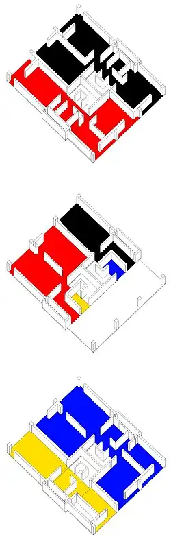 The site is steeply sloping (gradient 1 in 10), enabling the designers to maintain a constant roof level though the buildings ranged from four to 13 storeys. There were access roadways 10 feet (3.0 m) on every third storey; these serviced a one-storey flat beneath and a two-storey maisonette on that level and on the level above. The horizontal design repeated itself every three bays, centred on a H-frame that carried the services and stair columns. Each of these units contained a one-bedroom flat, a two-bedroom flat, a two-bedroom maisonette and a three-bedroom maisonette, and stair columns. The kitchens and bathrooms were vertically aligned, allowing simple ducting for services and the Garchey waste disposal system.[27]