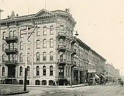 In its initial operation, the hotel was owned by Fred Michel and managed by Rush Field.[12] By May 17, 1879, the hotel was placed in receivership, though it was stated that the hotel would not close.[13] Michel arranged a banquet, later changed to a "grand military prize drill and brass band tournament", to raise funds, dispose of his real estate holdings, and adjust his and the hotel's financial matters. It was to be held on September 16–18, 1879.[14] By late October, a premature statement was made that the hotel would close, though a correction indicated the owners would make changes yet keep it open.[15] In November 1879, furniture and fixtures from the hotel were sold at auction.[16][17] In 1880, Michel proposed renting the vacant hotel at a nominal rate to the government for temporary use, and he offered to donate the park space he owned west of the hotel for a new federal courthouse.[18]