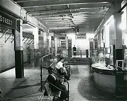 In July 1922, the Boston Transit Commission proposed the addition of a side platform adjacent to the outer northbound streetcar track, with a passageway under Tremont Street leading to two new entrances at Temple Place.[28] Opening the Winter Street Concourse to passengers was also proposed, but was soon rejected by the Department of Public Utilities in favor of continued use as storage space for adjacent businesses.[29] A more ambitious 1927 plan by one of the BERy trustees called for new side platforms on both sides of the streetcar level, with a sub-passage connecting the four streetcar platforms, as well as the Temple Place entrances and Winter Street passageway.[30] In 1933, the two stairway headhouses on the east side of Tremont Street were replaced with low walls, as had previously been done at Scollay Square and Adams Square.[31]