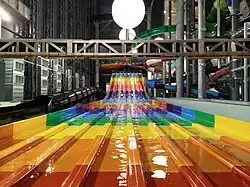 There are 35 water slides with a combined length of over 3.2 kilometres (2.0 mi), the longest of which is the Jungle Eclipse, measuring 256 metres (840 ft) in length. There are also inflatable ring slides, trapdoor slides and an 8-lane racing slide.[5] The slides are spread out over 6 stories.