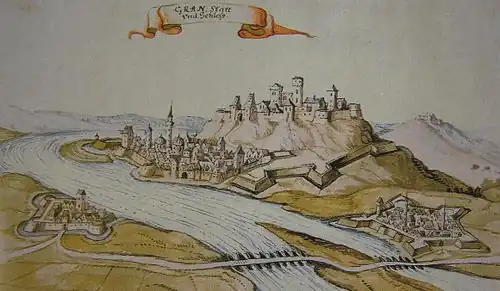 The 16th-century outpost was a rectangular wooden fortress on the north bank of the Danube. Its original appearance can be inferred from a drawing made by Jacob Hoefnagel who must have visited the area in 1595 after Gran was recaptured by the Habsburg army.[7] The fort of Parkan was completely destroyed in the siege but it can be seen that it was surrounded on three sides by a moat filled with the water of the Danube, and there were buildings inside, of which Hoefnagel could only see the ruins. The main defensive structure was a simple palisade without towers.