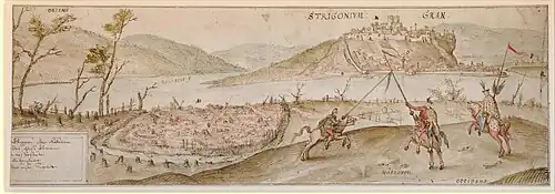The area north of the Danube was a contested borderland between the two empires even after the Treaty of Adrianople theoretically established peace in 1568. During raids, the Ottomans of Parkan regularly clashed with the soldiers of the nearest Hungarian border fortress, Újvár. Such clashes were recorded, among others, in 1557 and 1570.[4] A more serious incident took place in the spring of 1582, when Ottoman raiders drove away many cattle from near Újvár. In revenge, the captain of the fortress, Pál Rácz, launched a raid against Parkan, slaughtered several Turks there, and drove the herd off from the meadows. The Ottomans tried in vain to prevent this with cannonade from Estergon castle.[5] Another, much less successful raid, led by György Thurzó in 1590, probably also affected the area around Parkan; during this raid many Hungarian border fortress soldiers from Újvár lost their lives.[6]