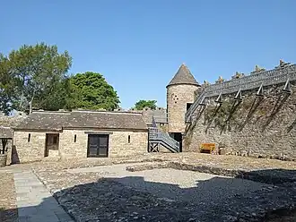 Staff kitchens were built to the south of the courtyard, adjoining the Gatehouse. A reconstruction of a smithy/forge was built along the southern wall, along with modern bathroom facilities. The 19th century stables were rebuilt along the western wall. Outside the bawn wall, several excavated sections of the moat were fenced off. The sweathouse at the end of the lawn was reconstructed and incorporated into the official visitor site, which is now designated as a National Monument.